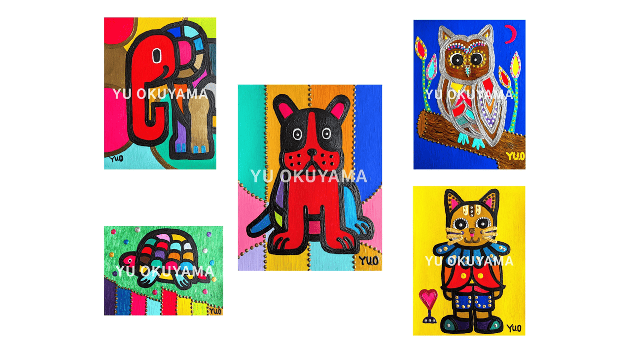 奥山優さんの作品の魅力は、動物が独特の太い線とカラフルな色づかいで描かれている点でしょう。