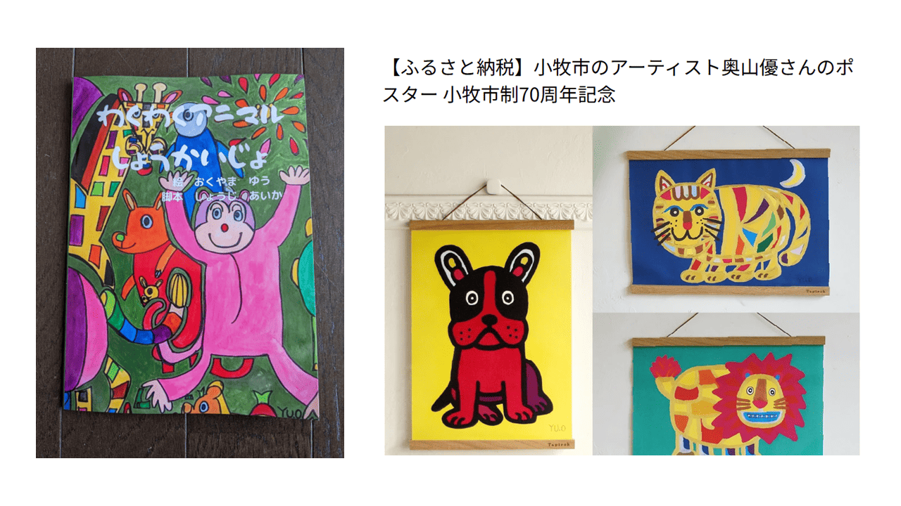 (写真左:奥山優さんが絵を描いた絵本、写真右:小牧市のふるさと納税返礼品のポスター・楽天市場より)