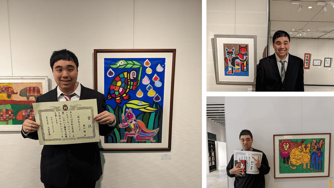 (写真左:第10回あいちアールブリュット展優秀作品賞受賞時 写真右上:第15回ふれあいアート展市長賞受賞時 写真右下:第3回こまきアールブリュット展市長賞受賞時)