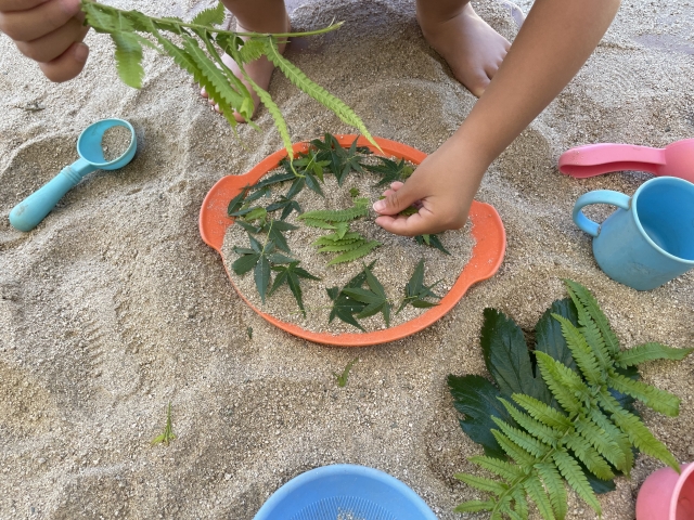 自然物での遊び:砂をケーキに、落ち葉をお金に見立てて遊ぶ。