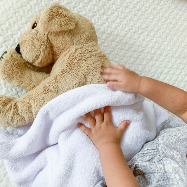 ぬいぐるみにご飯を食べさせたり、「ねんねしようね」とタオルをかけたりと、生活の再現が増えていきます。